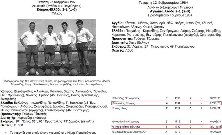 Στην πρώτη τίμηση δεν θα έπρεπε να είναι 7 τα άτομα, αλλά 8. Λείπει ο Γιώργος Κεφαλίδης. Το είχα αναρτήσει και παλαιότερα σαν πληροφορία, στο ιστολόγιο που διατηρούσαμε τότε, το παρουσιάζω και τώρα εδώ, αφού μετακομίσαμε. Παραθέτω απόκομμα της εφημερίδας “Αθλητική Ηχώ” (φύλλο 20/1/1964). Στην σύνθεση του Πιερικού φαίνεται καθαρά ότι συμμετέχουν με το Νο2 ο Κεφαλίδης και με το Νο11 ο Χριστοφορίδης. Λίγες μέρες πριν και λίγες μέρες μετά από αυτό το παιχνίδι που αναφέρω, η Εθνική είχε δώσει δύο παιχνίδια (παραθέτω τμήματα αρχείου της ΕΠΟ). Φαίνεται καθαρά ότι και οι δύο παίκτες μας συμμετείχαν στα δύα αυτά παιχνίδια της Εθνικής, και οι δύο παίκτες μας φορούσαν τα ίδια νούμερα στις φανέλες της Εθνικής (2 και 11), και οι δύο παίκτες μας είχαν 2 συμμετοχές συνολικά με την Εθνική, παίζοντας μάλιστα στα ίδια δύο παιχνίδια.