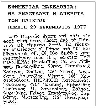 Με τη βοήθεια του Προέδρου Στέλιου Καραγεώργη η φωτογραφία είναι από τον αγώνα ΠΑΣ Γιάννινα – Πιερικός 2-0. Ο συγκεκριμένος αγώνας έγινε στους Ζωσιμάδες, τη Δευτέρα 26 Δεκεμβρίου 1977, με τις ομάδες των νέων λόγω απεργίας των ποδοσφαιριστών. Μέσα από το ρεπορτάζ της Μακεδονίας μπορούμε να αναζητήσουμε τα ονόματα των νεαρών ποδοσφαιριστών μας αν και ορισμένα απ’ αυτά παρουσιάζονται λανθασμένα.